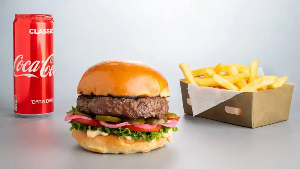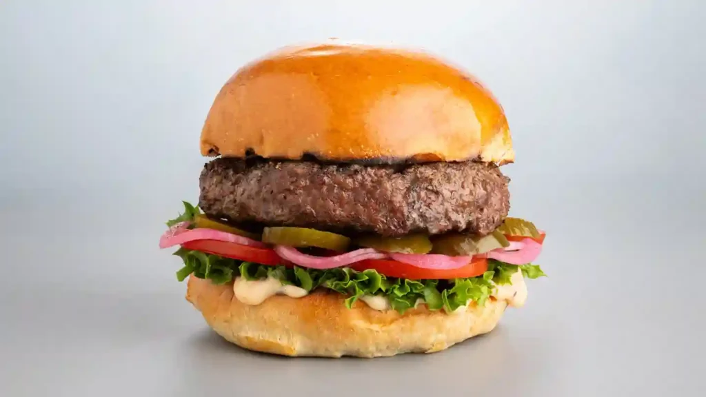 קציצת ההמבורגר האגדית שלנו (200 גרם) מוגשת בלחמנייה רכה עם רוטב איולי צ'ילי, חסה לליק, עגבנייה, מלפפון חמוץ מתוק ובצל סגול מוחמץ