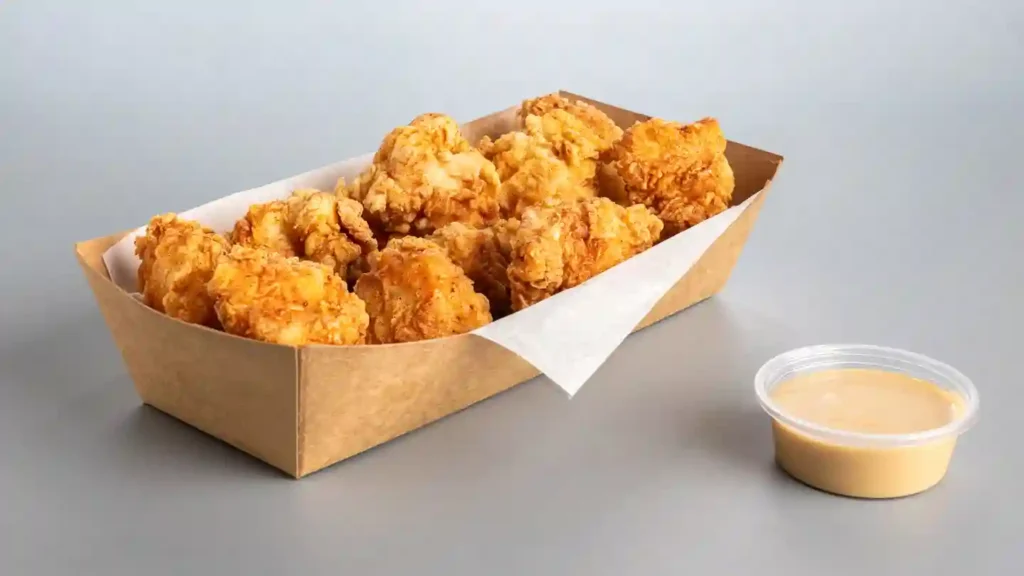 נגיסי עוף בציפוי קריספי. המנה מוגשת עם רוטב איולי חרדל מייפל בצד